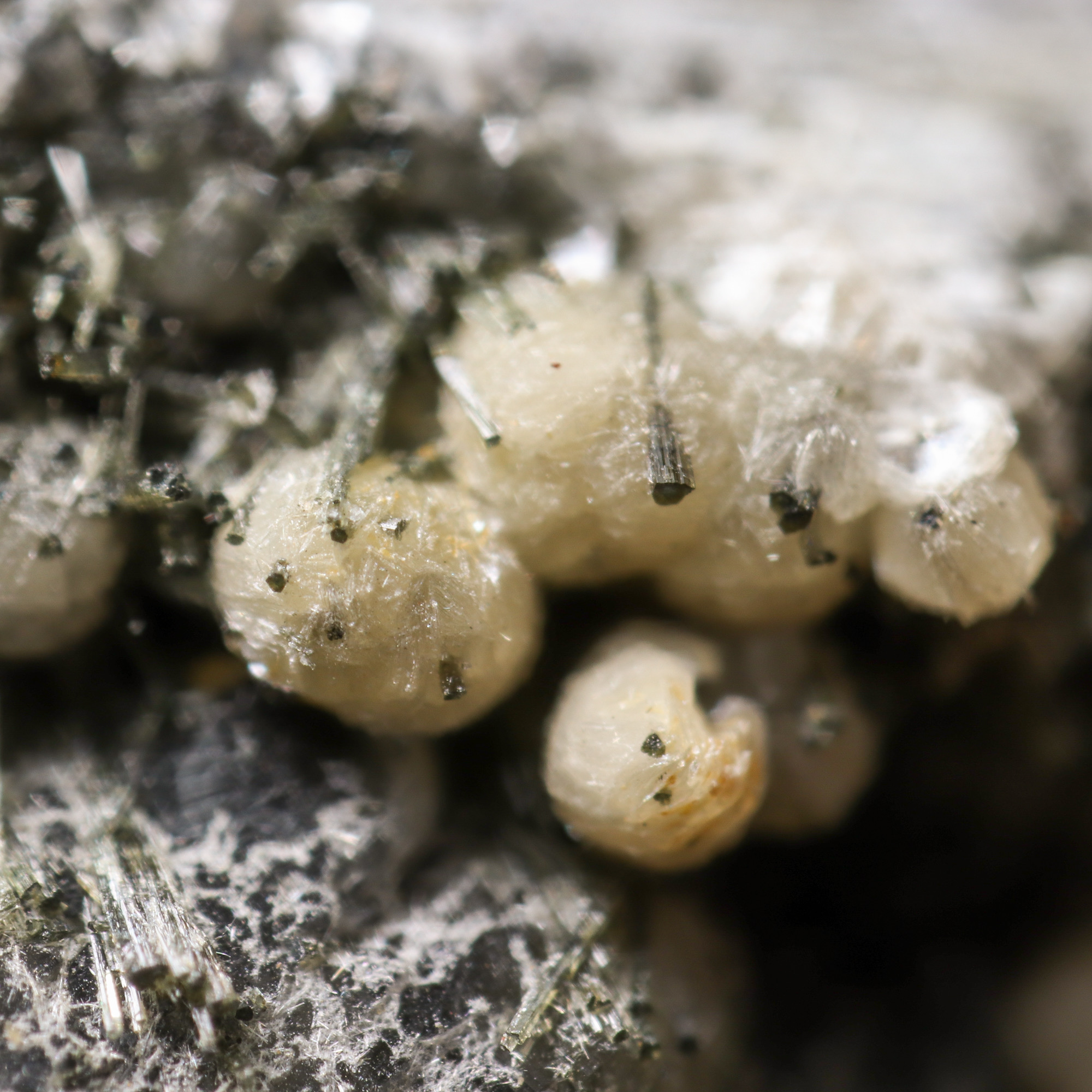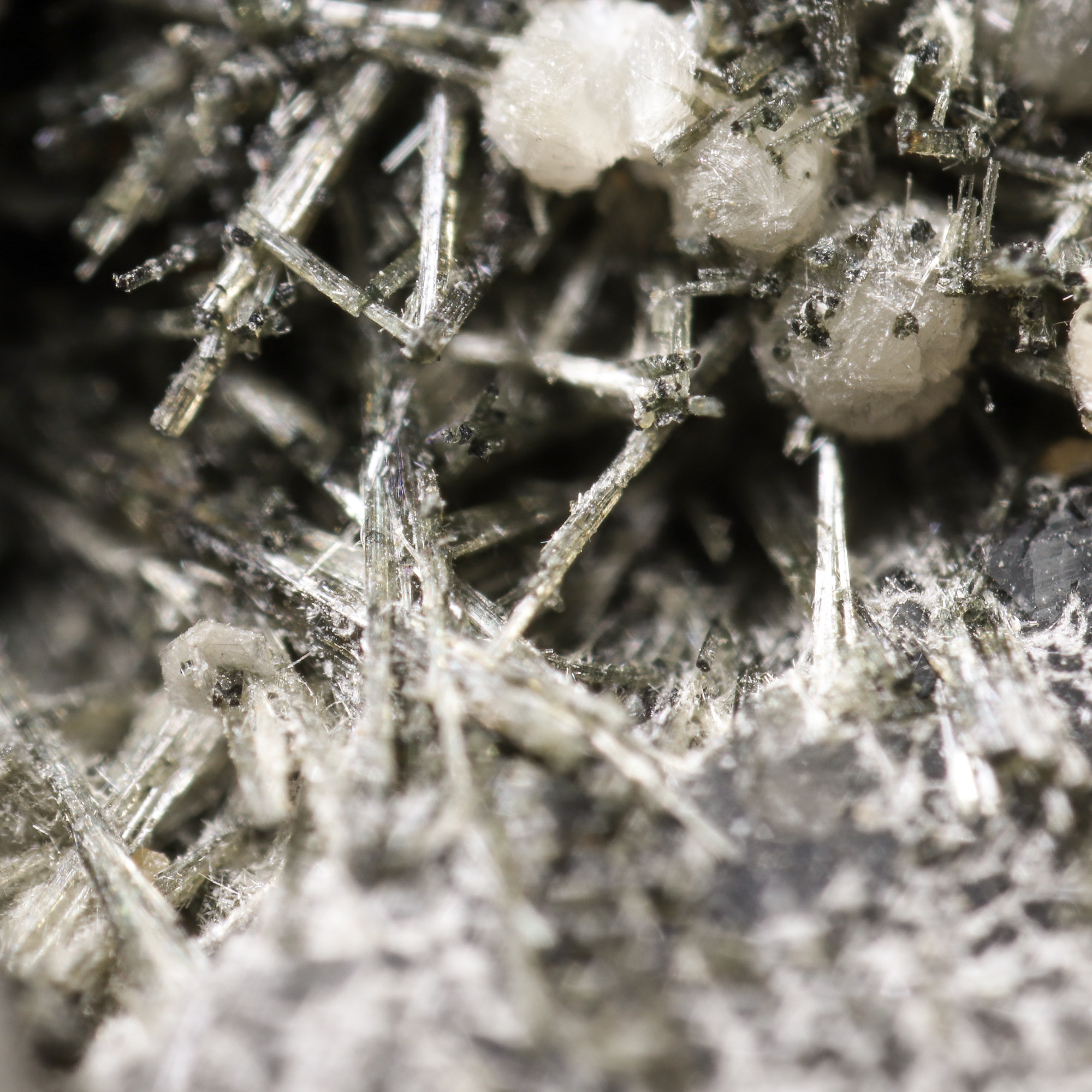 0120 Luinaite-(OH), Tourmaline, Muscovite, Mt Cleveland November 4, 2019 James Australasia Australia Tasmania Muscovite balls, grey/white fibrous Luinaite-(OH), Tourmaline and Dolomite from the Mt Cleveland Mine, Luina, Tasmania, Australia. Fluorite and Quartz are also present on this specimen, but are not captured in the images below. click to view full size image …