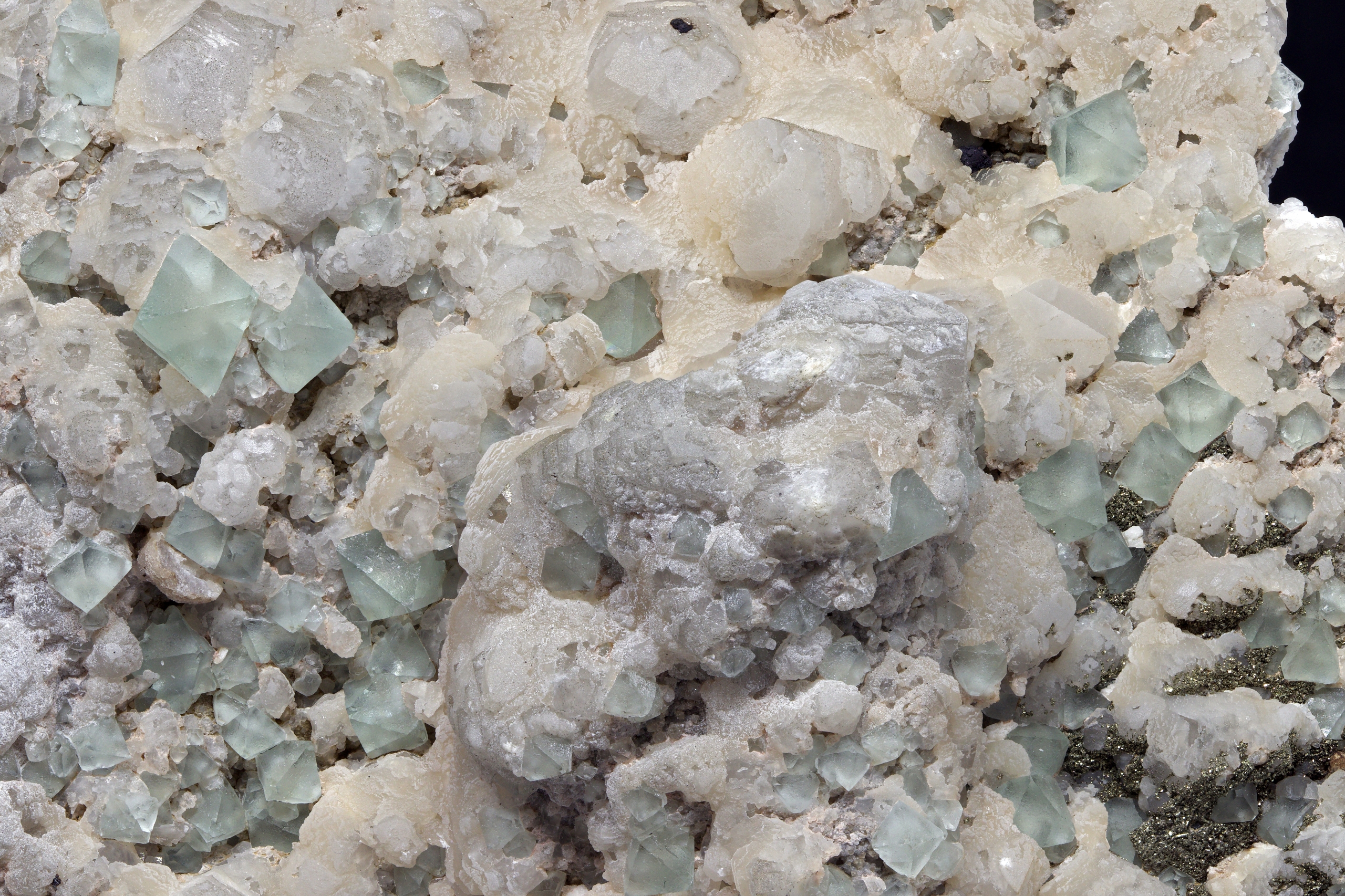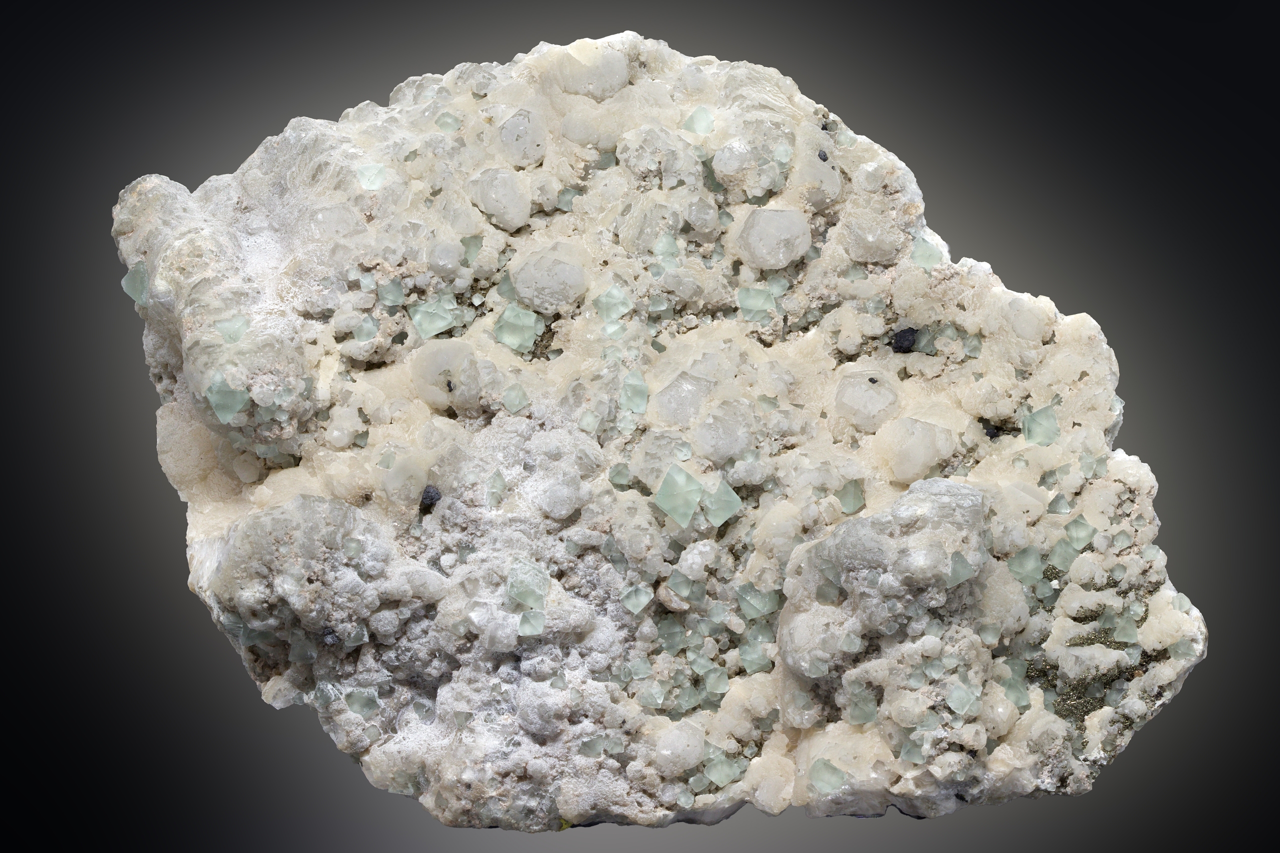 Pale green-blue octahedral Fluorite crystals with Calcite on a matrix consisting of mostly Calcite, some Sphalerite and minor Pyrite – from North Mine, Broken Hill, New South Wales, Australia. 19.6 x 13.3 x 3.8cm.