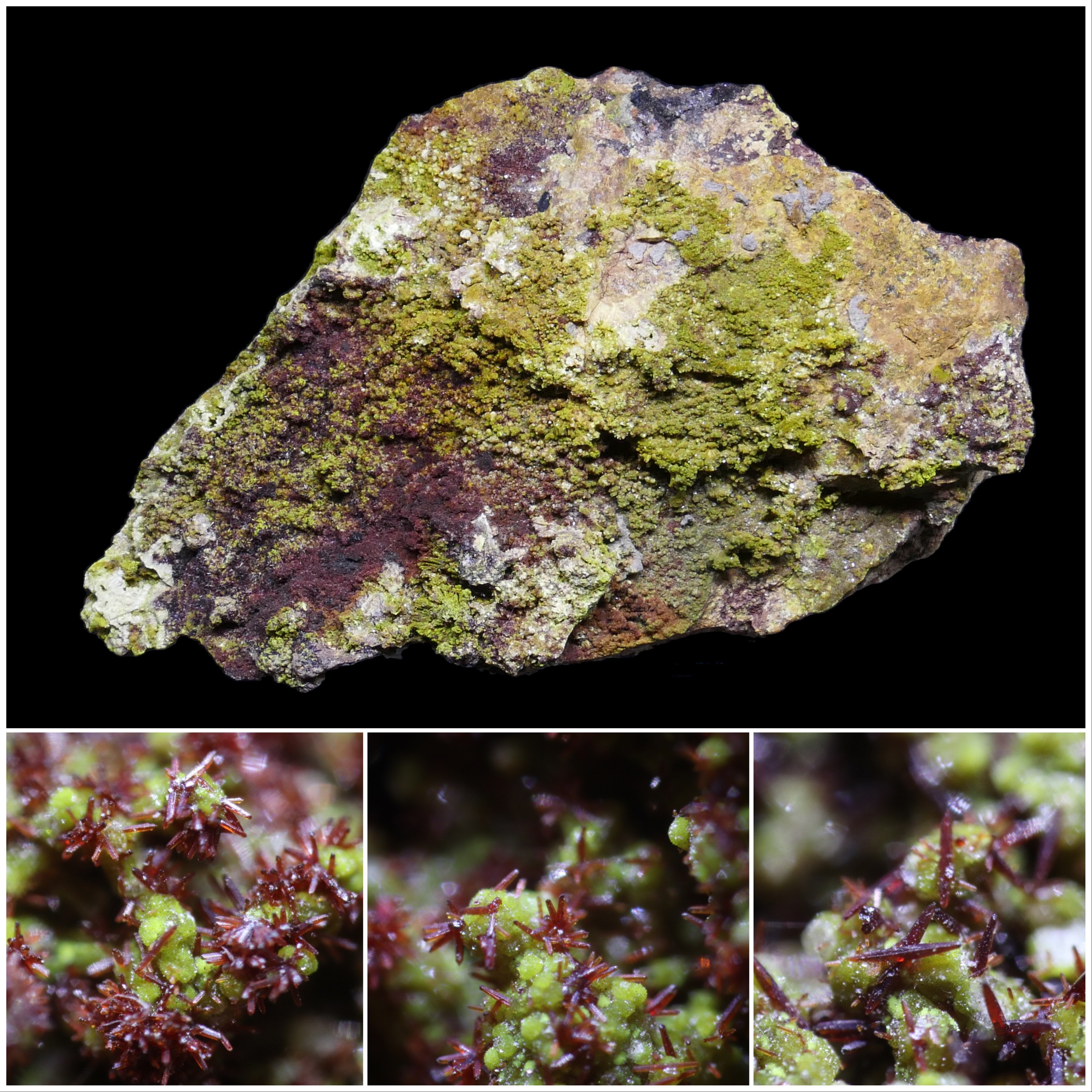 1523 Carminite, Beudantite-Segnitite, Broken Hill Mines April 29, 2020 James Australasia Australia New South Wales Red Carminite with yellow-green beudantite-segnitite collected during a field trip in the 1990’s to Kintore Opencut, Broken Hill, New South Wales, Australia. [95x55x30mm] FOV 40mm click to view full size image …