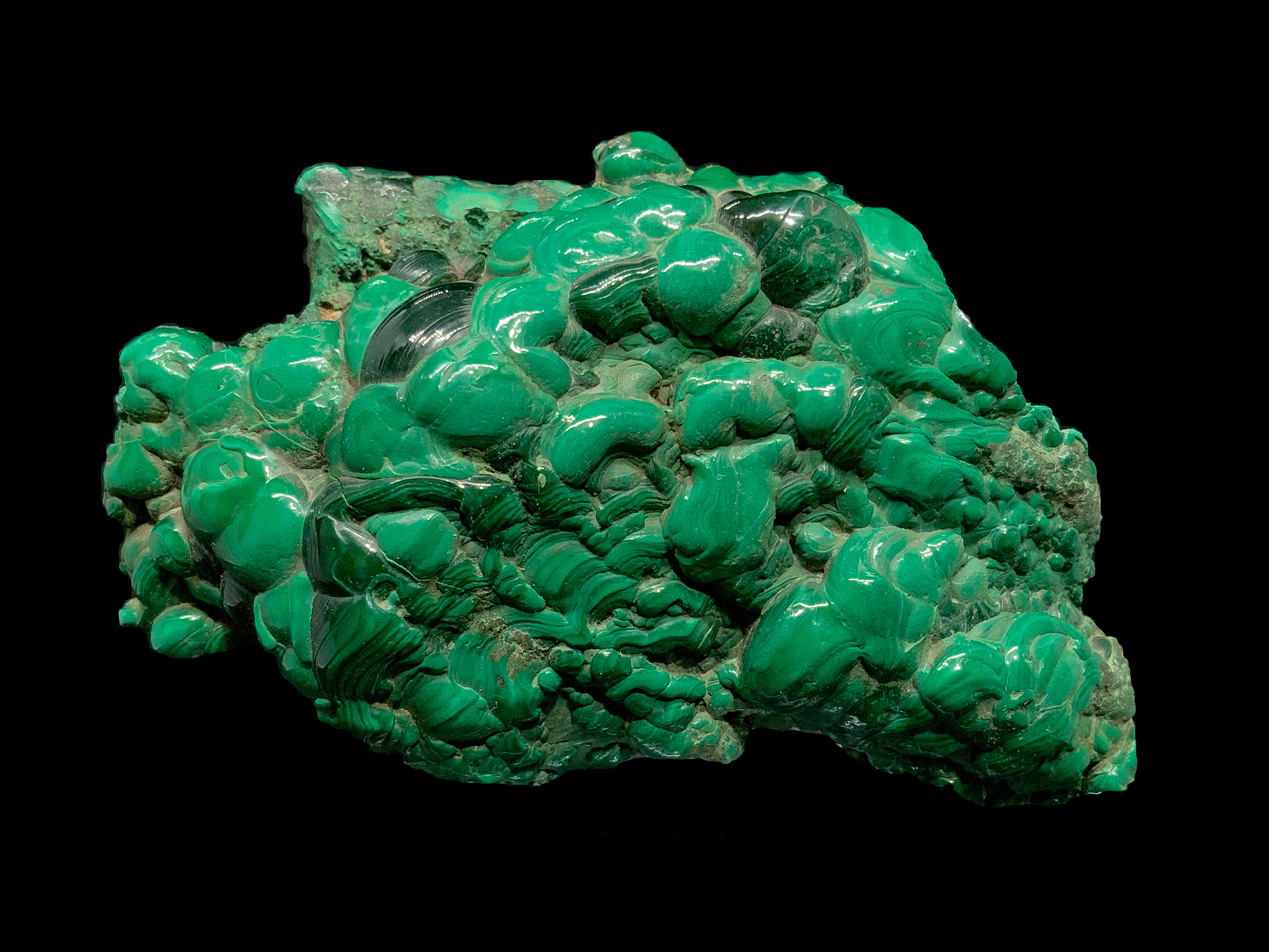 A specimen of botryoidal Malachite; old classic Australian material, from the early days of the Burra Burra Copper Mine, Mt Lofty Ranges, South Australia, Australia. There is also some minor Azurite on the reverse of the specimen that is not visible in this photo. [90x60x45mm]